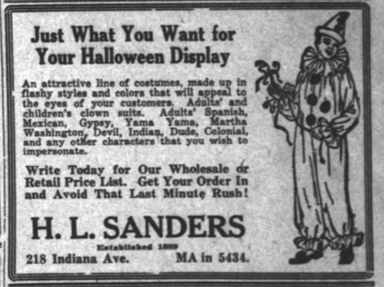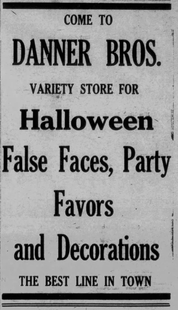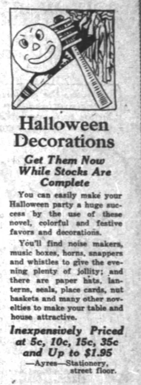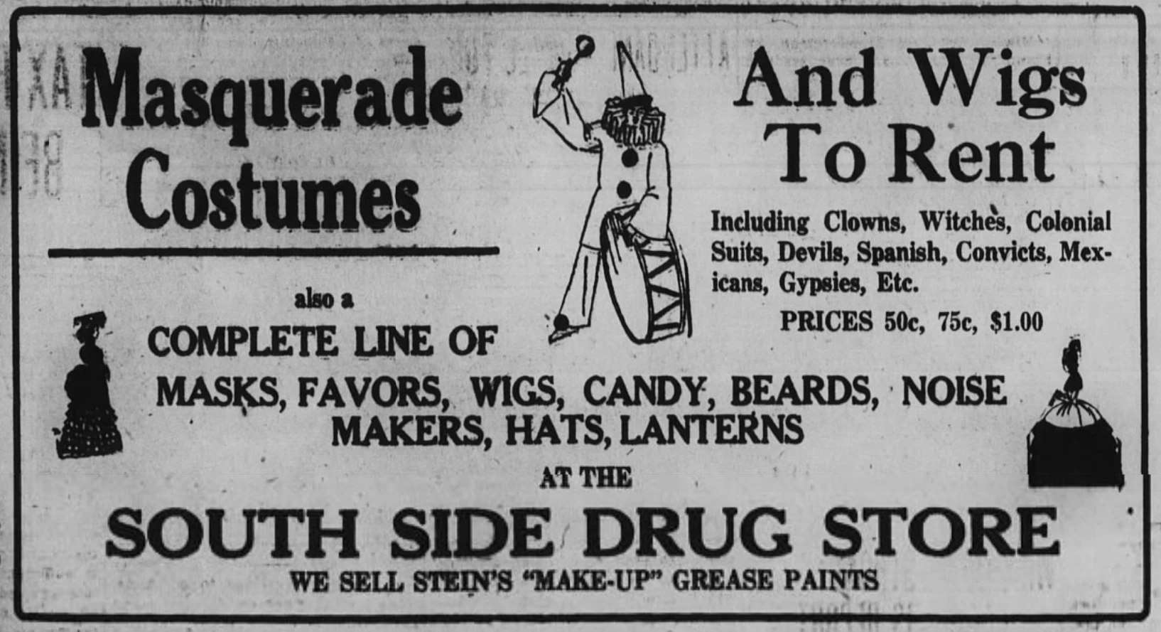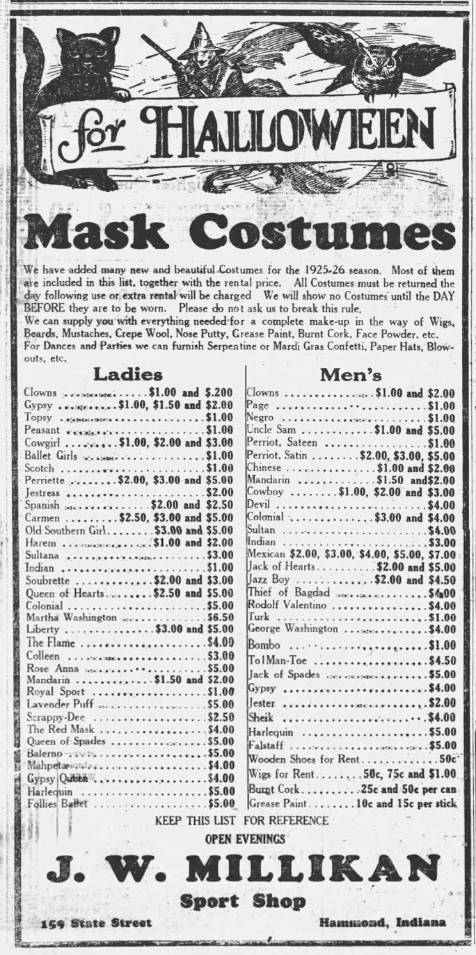 With Halloween tomorrow, I thought I'd share some of the ads I've collected from newspapers across Indiana to give you a glimpse of what Halloween was like in 1925. A hundred years ago, everything was cheap, there was a lot of "nose putty" involved, pumpkin pie was a Halloween thing, and the cuts (think clip art from 100 years ago) illustrating many of the ads were incredible. Plus, Chicago's best typeface, Cooper Black, makes a few appearances. Of course, this is America and so racism is also always close at hand: "Mexican" and "Chinaman" costumes are cheerily advertised and burnt cork, for blackface, is on sale for 50 cents. Scratch under any surface in this country—even the ones with seemingly immaculate spooky vibes—and there it is. A hundred years ago and right now are not that far apart in that way.