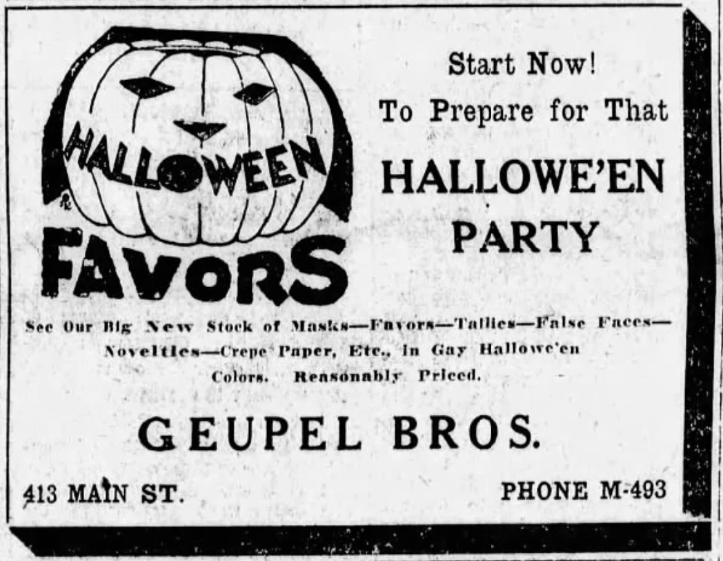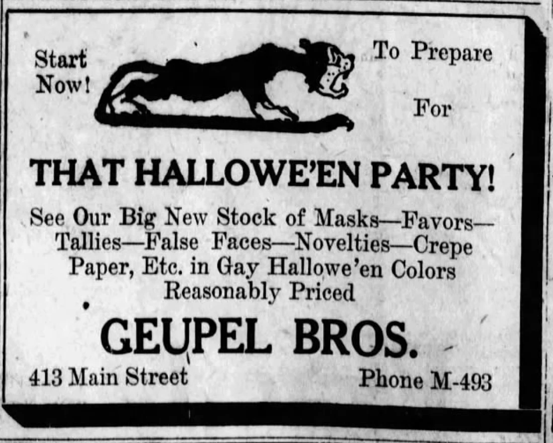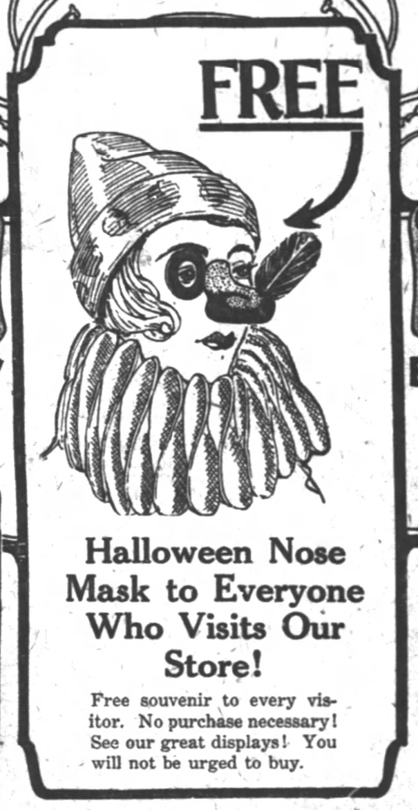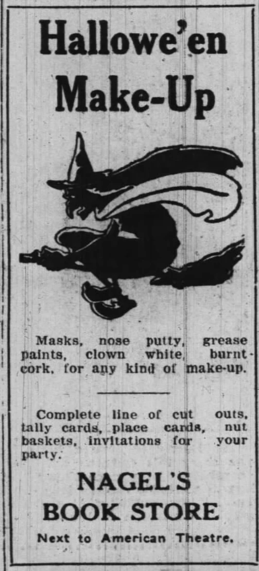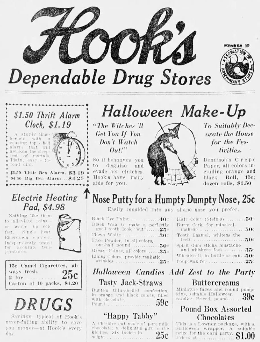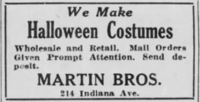 With Halloween tomorrow, I thought I'd share some of the ads I've collected from newspapers across Indiana to give you a glimpse of what Halloween was like in 1925. A hundred years ago, everything was cheap, there was a lot of "nose putty" involved, pumpkin pie was a Halloween thing, and the cuts (think clip art from 100 years ago) illustrating many of the ads were incredible. Plus, Chicago's best typeface, Cooper Black, makes a few appearances. Of course, this is America and so racism is also always close at hand: "Mexican" and "Chinaman" costumes are cheerily advertised and burnt cork, for blackface, is on sale for 50 cents. Scratch under any surface in this country—even the ones with seemingly immaculate spooky vibes—and there it is. A hundred years ago and right now are not that far apart in that way.