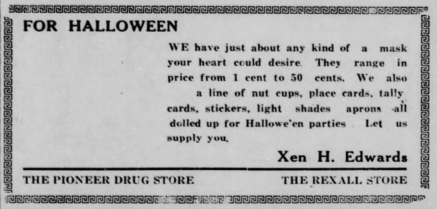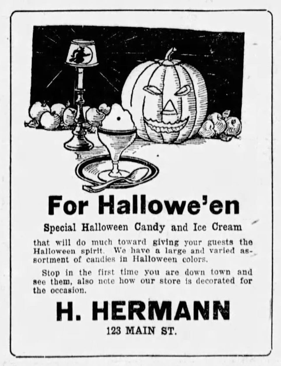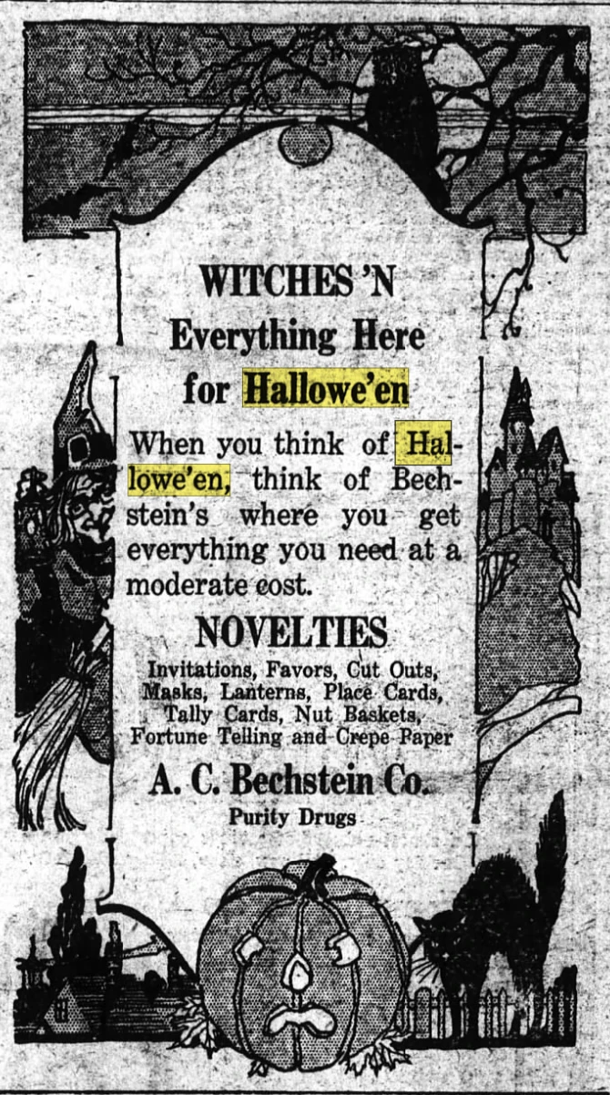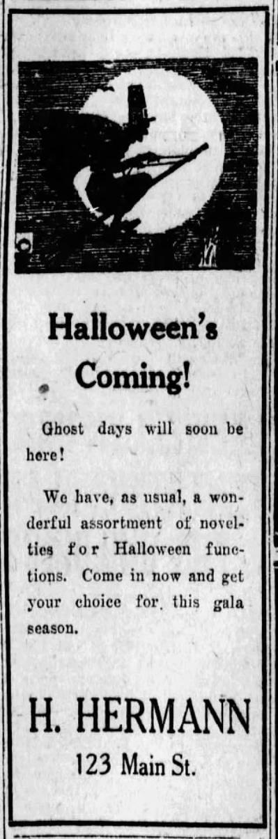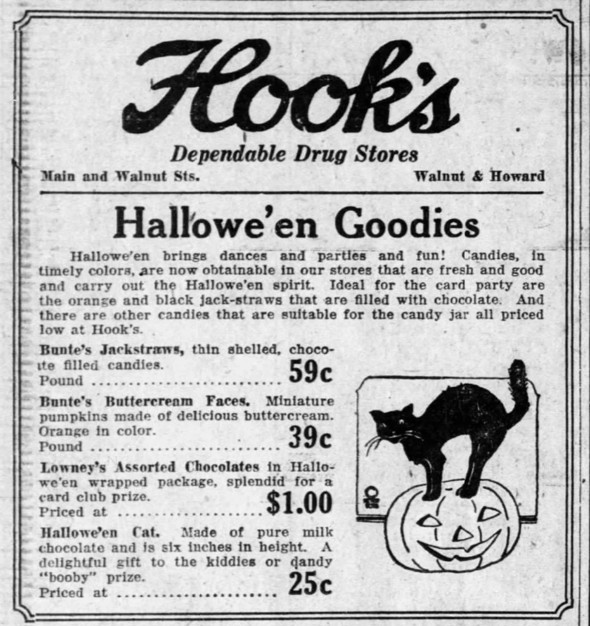 With Halloween tomorrow, I thought I'd share some of the ads I've collected from newspapers across Indiana to give you a glimpse of what Halloween was like in 1925. A hundred years ago, everything was cheap, there was a lot of "nose putty" involved, pumpkin pie was a Halloween thing, and the cuts (think clip art from 100 years ago) illustrating many of the ads were incredible. Plus, Chicago's best typeface, Cooper Black, makes a few appearances. Of course, this is America and so racism is also always close at hand: "Mexican" and "Chinaman" costumes are cheerily advertised and burnt cork, for blackface, is on sale for 50 cents. Scratch under any surface in this country—even the ones with seemingly immaculate spooky vibes—and there it is. A hundred years ago and right now are not that far apart in that way.