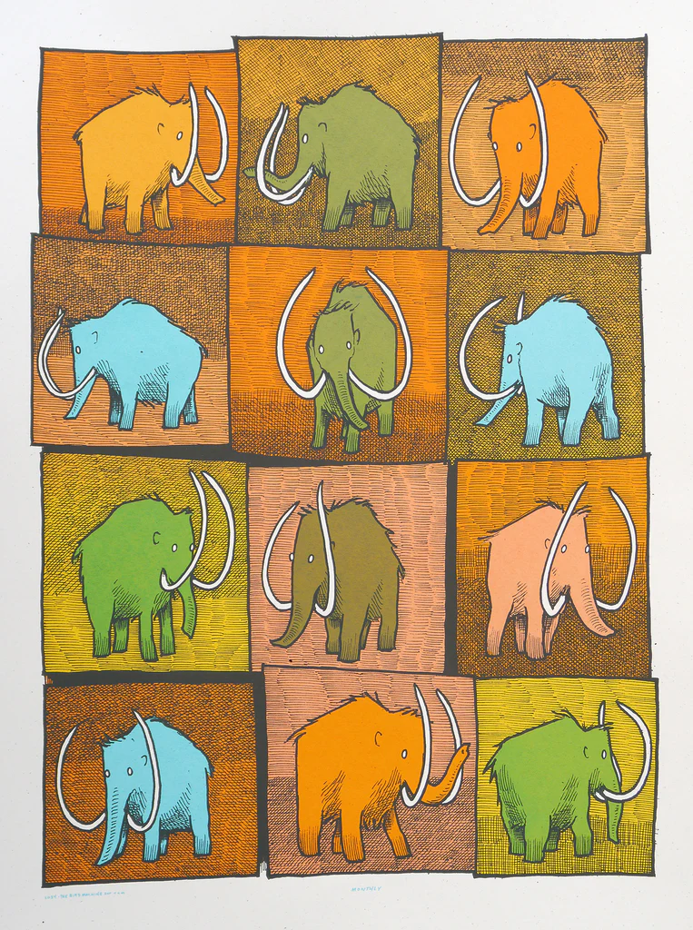 I shared office space with Jay Ryan at The Bird Machine for years, and I continue to be in awe of his work. Everything he does is joyful in a way that is so uniquely him, and his color palatte is always stunning too. Anything he does is worth picking up, but I'm especially in love with this portrait of 12 wooly mammoths. You can see more of Jay's mammoths at Chicago's Field Museum's After the Age of Dinosaurs exhibit.