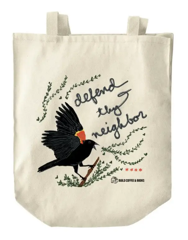 My pal Eve Ewing bought a bookstore earlier this year and this fall, when shit was getting rocky in town and we were all out on the street protecting each other, designed this wonderful totebag featuring a red winged blackbird in full attack mode. I love it so much. Plus, a percentage goes toward Organized Communities Against Deportations.