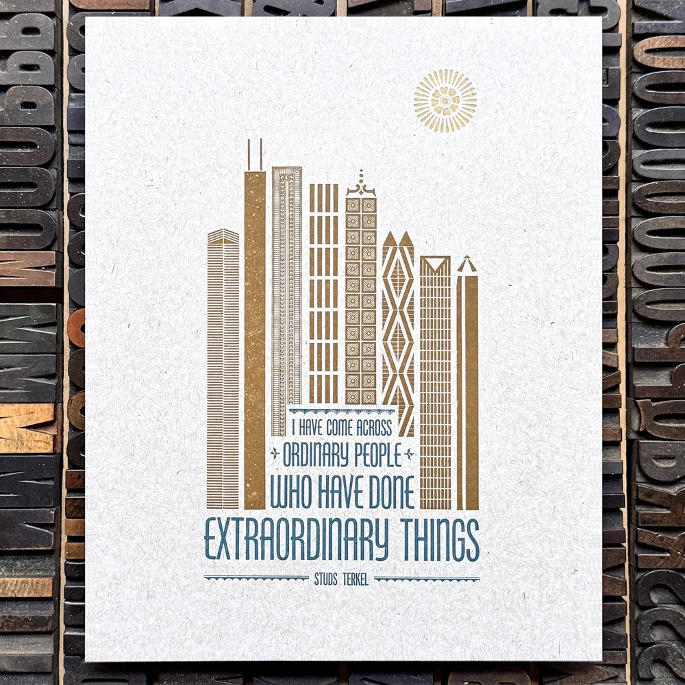 Chicago letterpress printer Jen Farrell has built a career on stunning letterpress creations hand-printed on century-old printing presses. One of her truly unique specialties is building urban landscapes from metal type, and she did a beautiful tribute to Chicago's pushback against ICE this fall featuring a quote from Chicago's legendary Studs Terkel. Jen also made a print from something I wrote on this blog earlier this year, which was super cool to be involved with.